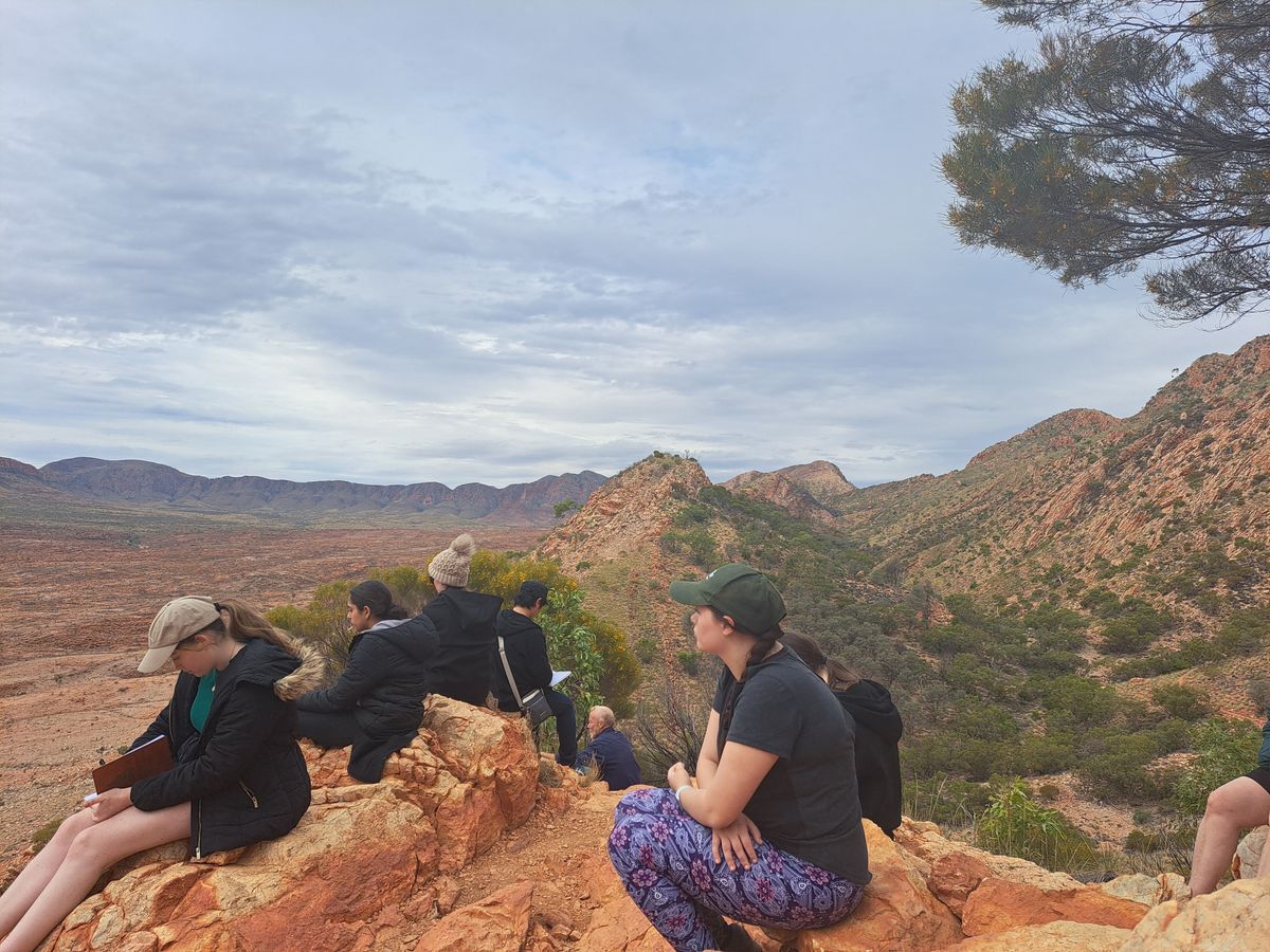 Upon arrival into Australia’s red centre, a short ten-minute drive from Alice Springs Airport brought us to Campfire in the Heart Retreat Centre. The space held a main retreat house alongside a few other cabins on a breathtaking property backing on to the West MacDonnell ranges. Our time at Campfire involved sleeping in swags, sitting around fires, and walking on the red dirt, and we very quickly developed a deep sense of groundedness and connection to country.